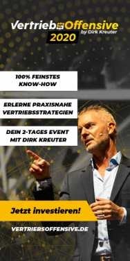 Das größte und erfolgreichste Seminar von Dirk Kreuter ist die 2 tägige Vertriebsoffensive. In 2019 haben mehr als 40.000 erfolgshungrige Menschen an dem Live Event teilgenommen. Die Vertriebsoffensive 2021 findet zum Teil digital statt, es sind aber auch echte LIVE Veranstaltungen geplant, je nachdem wie es die Pandemie zulässt.